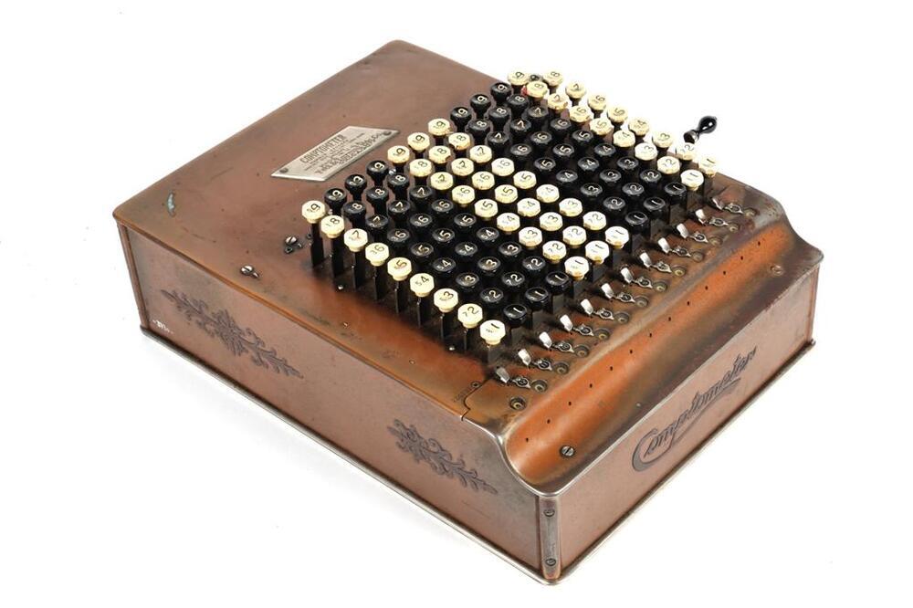 De comptometer werd ontwikkeld in 1887 en was de eerste commerciële mechanische rekenmachine met toetsen. Dit model bestaat uit 12 keer 9 toetsen waarmee opgeteld, afgetrokken, vermenigvuldigd en gedeeld kon worden. De getallen rollen dan te voorschijn in daarvoor gemaakte kijkgaatjes. De machine heeft ook een hendel (om de getallen weer op 0 te zetten). Deze machine draagt het nummer 236730.