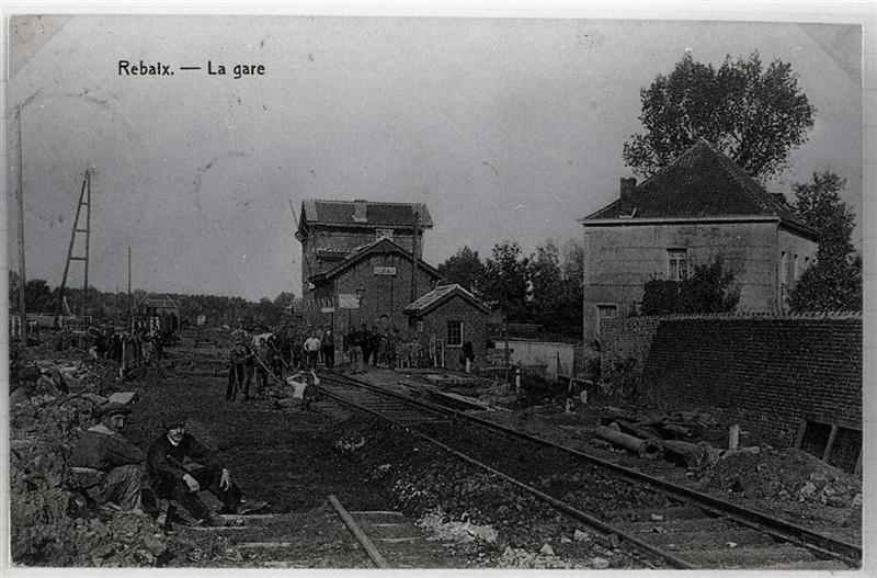 Reproductie van een postkaart met als opschrift 'Rebaix. - La gare'. Spoorleggers hernieuwen de ballast en de sporen ter hoogte van het stationsgebouw. Links van lijn 90 (Denderleeuw - Saint-Ghislain) zijn telefoonpalen zichtbaar. Op de achtergrond een open goederenwagen opgesteld voor een laadprofiel.