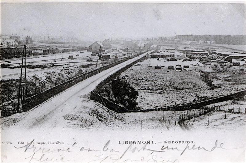 Reproductie van een postkaart met als opschrift 'Libramont. Panorama.' en als uitgever 'Edit. I. Duparque, Florenville'. Onderaan staat een handgeschreven boodschap. Links kunnen we vaag in de sneeuw de sporenbundel met open en gesloten goederenwagens onderscheiden. Op een zijspoor staat een rijtuig opgesteld. Het spoorwegdomein is afgebakend met afgedankte dwarsliggers. Naast de dienstweg staan telefoonpalen opgesteld.