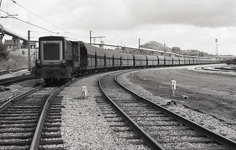 BeschrijvingEen rangeerlocomotief van de reeks 83 staat vertrekkensklaar met een lange sleep tremelwagens. Tussen de sporen zijn enkele dwergseinen te zien.
