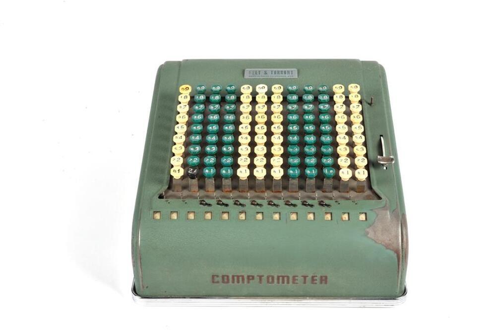 De comptometer werd ontwikkeld in 1887 en was de eerste commerciële mechanische rekenmachine met toetsen. Dit model bestaat uit 12 keer 9 toetsen waarmee opgeteld, afgetrokken, vermenigvuldigd en gedeeld kon worden. De getallen rollen dan te voorschijn in daarvoor gemaakte kijkgaatjes. De machine heeft ook een hendel (om de getallen weer op 0 te zetten). Deze machine heeft als nummer M470042.