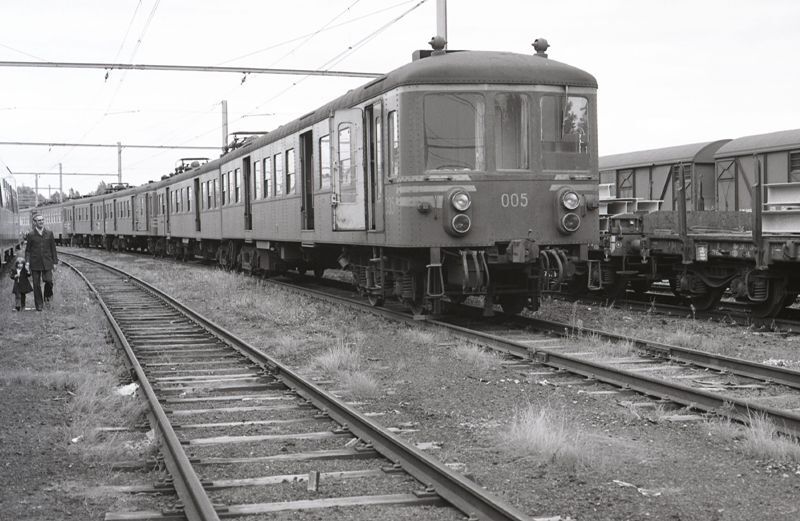 Dit motorstel behoort tot de reeks 00, schijf 1939. Aan dit stel zijn andere stellen gekoppeld. Rechts zien we platte wagens met rongen en gesloten goederenwagens. Geheel ongebruikelijk zien we links van de foto een man met kind in deze sporenbundel. Schenking van Myriam Hendrickx.