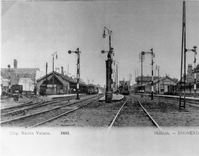 Reproductie van een postkaart met als opschrift 'Station, - Roosendaal. (N.-B.)' en als uitgever 'Uitg. Nauta Velsen. 2483.' Roosendaal ligt enkele kilometers verwijderd van de Belgisch-Nederlandse grens. We zien het eerste stationsgebouw dat in 1907 door het huidige vervangen werd. Een stoomlocomotief met reizigerstrein wacht op groen sein om in de richting van Antwerpen te vertrekken. Naast de sporen staan mechanische seinen, telefoonpalen en centraal een waterkolom opgesteld. De perrons worden verlicht met petroleumlampen die door de lampenist op- en neergelaten kunnen worden. Op het doodlopend spoor rechts is een reizigerstrein opgesteld die uit rijtuigen met drie assen bestaat.