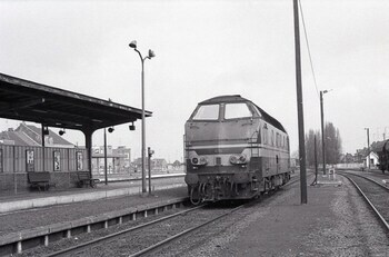 BeschrijvingOp de foto zien we diesellocomotief 6296 in station Moeskroen. Op het perron links staan een verlichtingspaal en een kar bestemd voor het vervoer van pakjes en bagage.