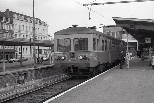 BeschrijvingWe zien motorwagen 4326 aan het perron in station Kortrijk. Twee spoorwegmannen praten op het perron. Op de achtergrond zien we de baan naast het station van Kortrijk.