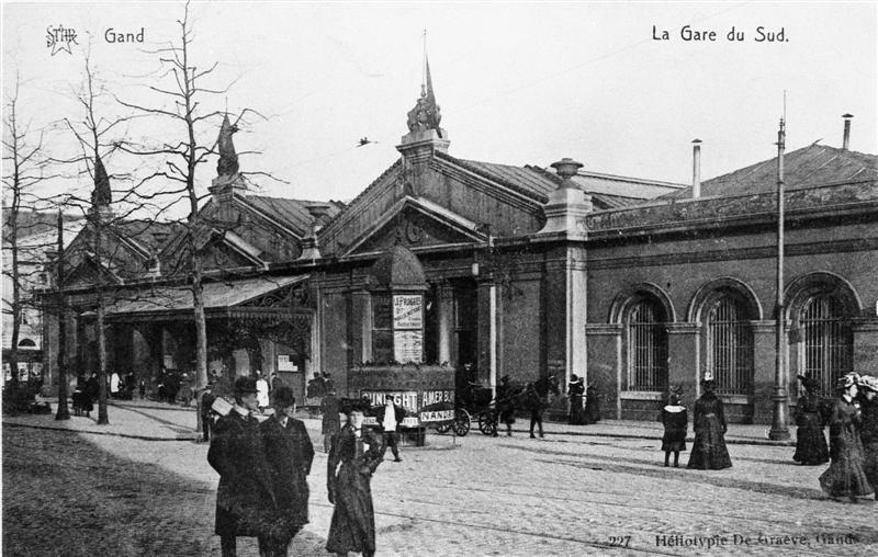 Reproductie van een postkaart met als opschrift 'Gand La Gare du Sud.' en als uitgever '227 Héliotypie De Graeve, Gand.' Voor de zijgevel van het station staan een openbaar urinoir en een paardenkoets. Boven de ingang is een luifel aangebracht. Over de straat lopen mensen heen en weer.