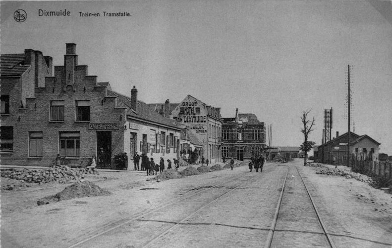 Reproductie van een postkaart met als opschrift 'Dixmuide Trein-en Tramstatie.' met bovenaan links het logo van de uitgever. Rechts van de tramsporen zien we telefoon- en telegraafpalen samen met het voorlopige station dat na de Eerste Wereldoorlog opgebouwd werd. Op de achtergrond staat nog een ruïne overeind. Enkele woningen zijn reeds uit hun puin herrezen.