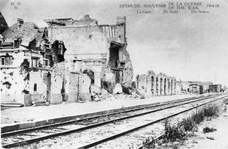 Reproductie van een postkaart met als opschrift 'Dixmude. Souvenir de la Guerre. of the War. 1914-1918. La Gare. - De Statie. - The Station.' met bovenaan links het logo van de uitgever. We zien de perronzijde van het totaal verwoeste stationsgebouw.