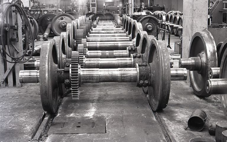 BeschrijvingWe zien een aantal wielen van locomotieven en treinstellen in de Centrale Werkplaats van Salzinnes.