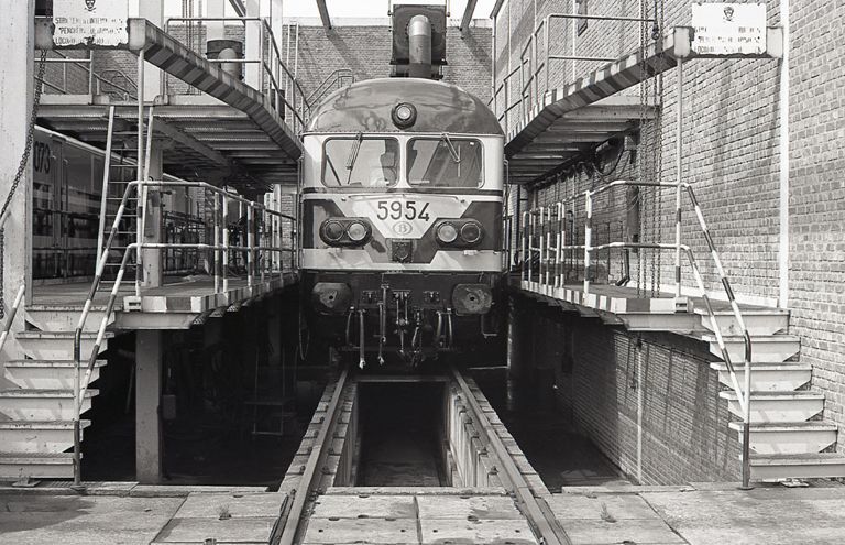 Vooraanzicht van een diesellocomotief van de reeks 59 (ex-type 201) tijdens een onderhoudsbeurt. De locomotief staat op een speciaal spoor waarbij men werken kan uitvoeren aan de onderzijde van de machine. Via de verhoogde bruggen kan men ook aan de bovenkant van de locomotieven werken. Schenking van Myriam Hendrickx.
