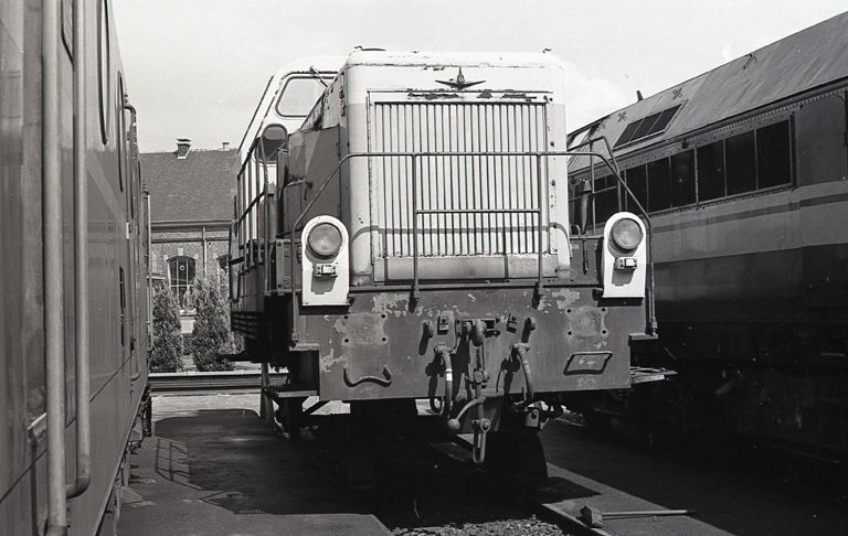 Vooraanzicht van een rangeerlocomotief van de reeks 81. De wielen en het onderstel van de locomotief zijn verwijderd in afwachting van een herstelling in de centrale werkplaats. Links en rechts staan nog twee andere diesellocomotieven. Schenking van Myriam Hendrickx.