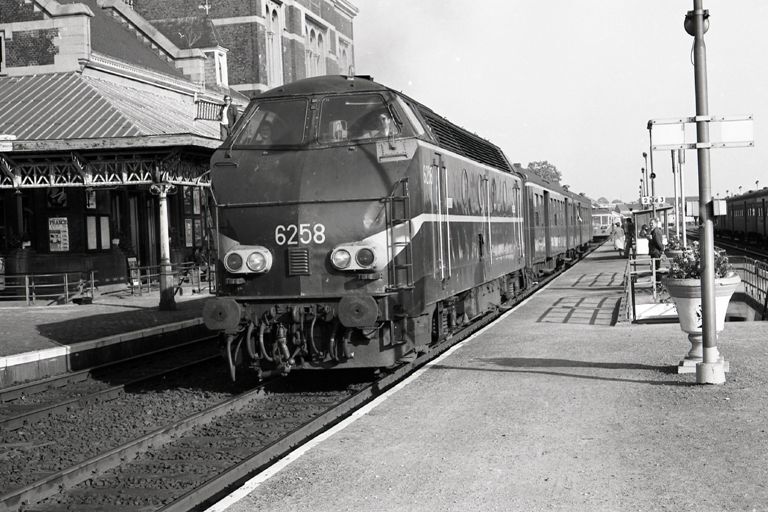 Deze locomotief behoort tot de reeks 62 (ex-type 212). Zij heeft een trein bestaande uit M 1-rijtuigen aan de haak. Links zien we het stationsgebouw met luifel. Op het tweede perron zien we een typische bloempot uit deze tijd. Schenking van Myriam Hendrickx.