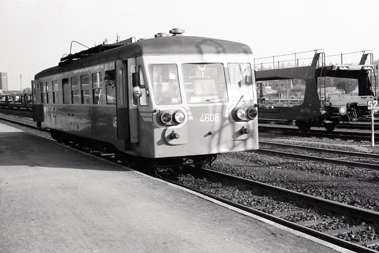 Deze motorwagen behoort tot reeks 46 (ex-type 554). Naast de motorwagen staan een aantal wagens voor vervoer van auto's opgesteld. Uiterst recht op de foto zien we kilometerpaal '52' van de lijn 94 (Halle - Franse grens). Schenking van Myriam Hendrickx.