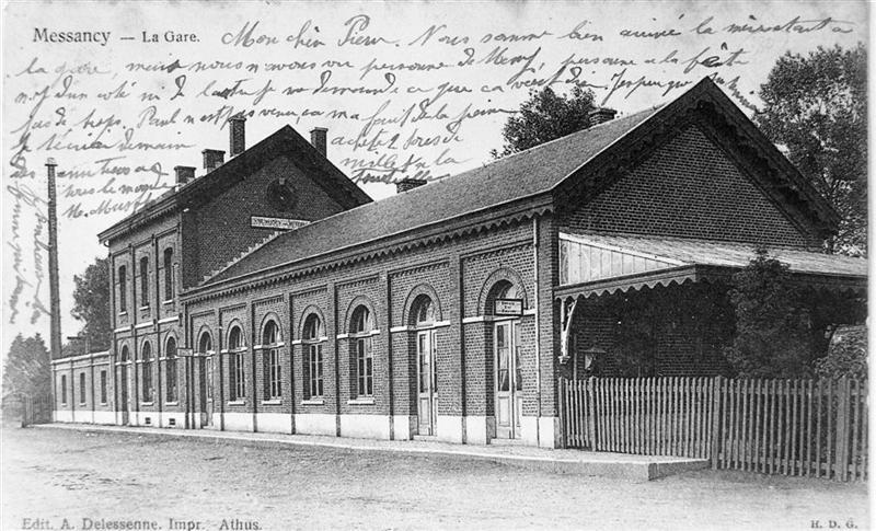 Reproductie van een postkaart met als opschrift 'Messancy - La Gare.' en als uitgever 'Edit. A. Delessenne. Impr. Athus. H.D.G.' Bovenaan staat een handgeschreven boodschap. De postkaart toont de voorzijde van het stationsgebouw. Op de zijgevel is een deel van de glazen perronoverkapping te zien.