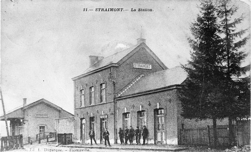 Reproductie van een postkaart met als opschrift '11 - Straimont. - La Station.' en als uitgever 'Ed. L. Duparque. - Florenville.' De postkaart toont de voor- en zijgevel van het station. Voor het gebouw poseren zeven mannen. Links van het station bevindt zich de goederenloods.