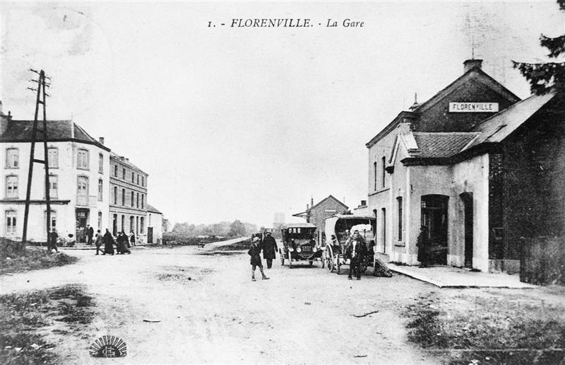Reproductie van een postkaart met als opschrift '1. - Florenville. - La Gare' met onderaan links het logo van de uitgever. Voor het stationsgebouw wachten een auto en een paard met kar. Voorbijgangers verplaasten zich over het onverharde stationsplein. Links van het station zijn de goederenloods en de watertoren voor de bevoorrading van de stoomlocomotieven nog net zichtbaar.