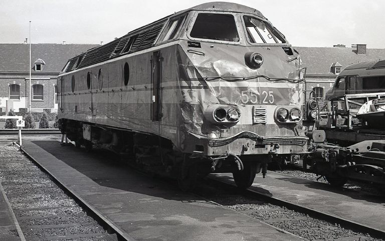 We zien een beschadigde locomotief van de reeks 55 (ex-type 205) voor de Centrale Werkplaats van Salzinnes. De stuurpost van de locomotief is ingedeukt na een botsing en zal in de werkplaats hersteld worden. Op de achtergrond zien we een administratief gebouw van de werkplaats. Schenking van Myriam Hendrickx.