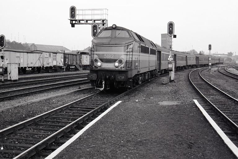 Diesellocomotief 5182 behoort tot de reeks 51. Deze locomotief heeft een trein bestaande uit K 1-rijtuigen aan de haak. Links en rechts van de trein zien we stopseinen van het type I. Links van de locomotief staan enkele werkwagens langs het spoor. In deze werkwagens was een tijdelijk magazijn ingericht of een eet- en kleedruimte voor het personeel voorzien Schenking van Myriam Hendrickx.