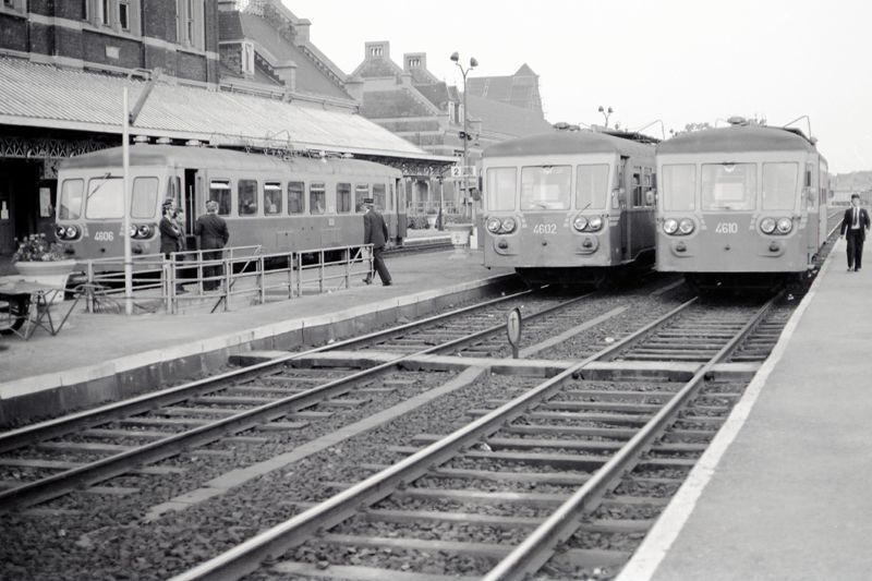 Deze motorwagens behoren tot de reeks 46. Op deze foto zien we controlepersoneel in het typische donker uniform van toen. Merk ook de typische bloempotten van deze tijd op (links op het perron).