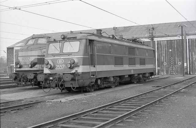 BeschrijvingOp de foto zien we diesellocomotief 6002 en elektrische locomotief 2557 voor de poorten van de stelplaats Brussel-Zuid, gelegen in Vorst.