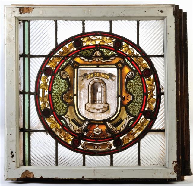 Glas-in-loodraam met in het midden het wapenschild van de stad Spa in een grote cirkel. De band rond de cirkel werd versierd met kleinere cirkels en florale patronen. Onderaan de band staat het opschrift 'Spa Pouhon'. 'Pouhon' verwijst naar de Pouhon-bron, die wordt afgebeeld op het wapen.