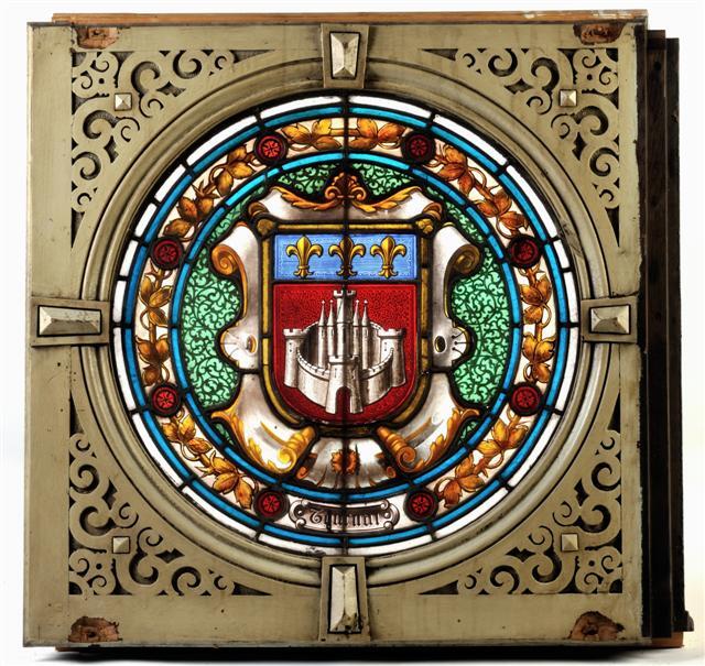 Glas-in-loodraam met in het midden het wapenschild van de stad Doornik in een grote cirkel. De cirkel is binnenin versierd met decoratieve patronen. De band rond de cirkel heeft kleinere cirkels en florale patronen. Onderaan de band staat het opschrift 'Tournai'. De lijst bestaat uit sierlijk houtsnijwerk.