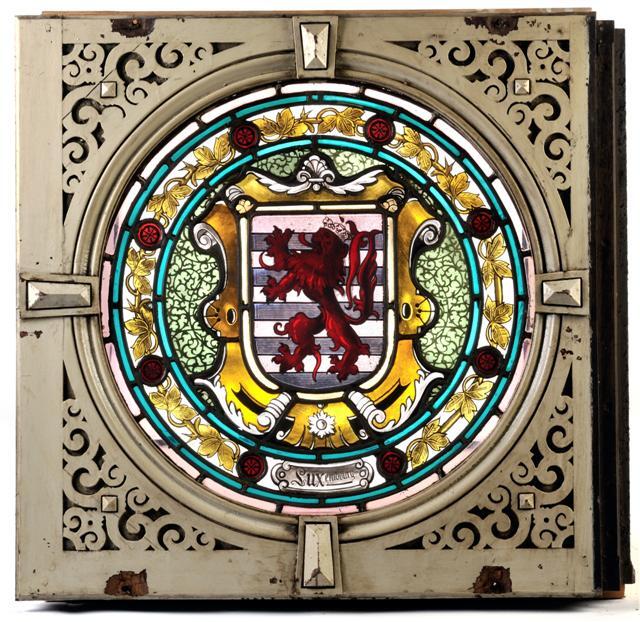 Glas-in-loodraam met in het midden het wapenschild van de provincie Luxemburg in een grote cirkel. De cirkel is binnenin versierd met decoratieve patronen. De band rond de cirkel heeft kleinere cirkels en florale patronen. Onderaan de band staat het opschrift 'Luxembourg'. De lijst bestaat uit sierlijk houtsnijwerk.