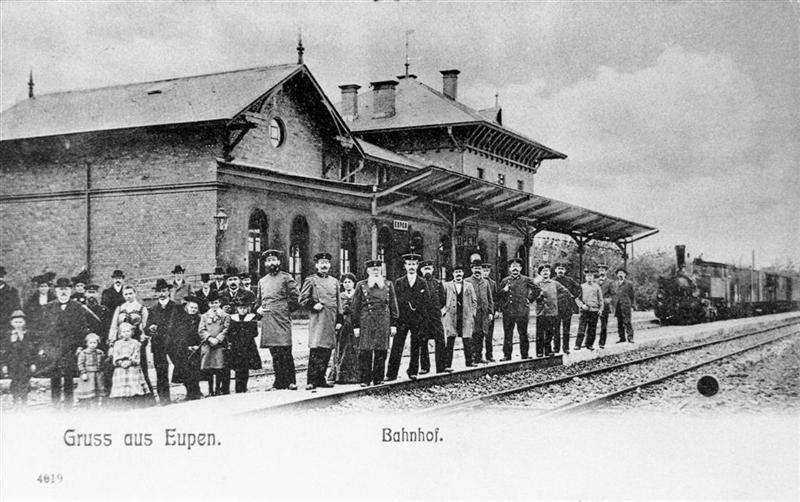 Reproductie van een postkaart met als opschrift '4619 Gruss aus Eupen. Bahnhof.' Deze foto toont de achterzijde van het eerste station van Eupen. Op het perron poseren bewoners en stationspersoneel in Pruisische uniformen. Het gebouw is uitgerust met een luifel. Op spoor 1 staat een Duitse tenderlocomotief met een sleep rijtuigen.