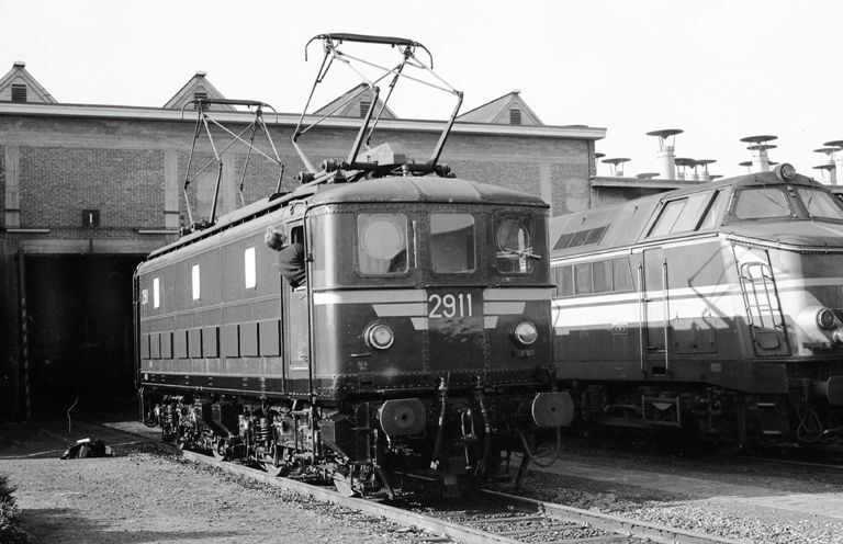 Locomotief 2911 behoort tot de reeks 29. Rechts zien we ook nog een diesellocomotief. Beiden staan voor de poorten van de dieseltractiewerkplaats.