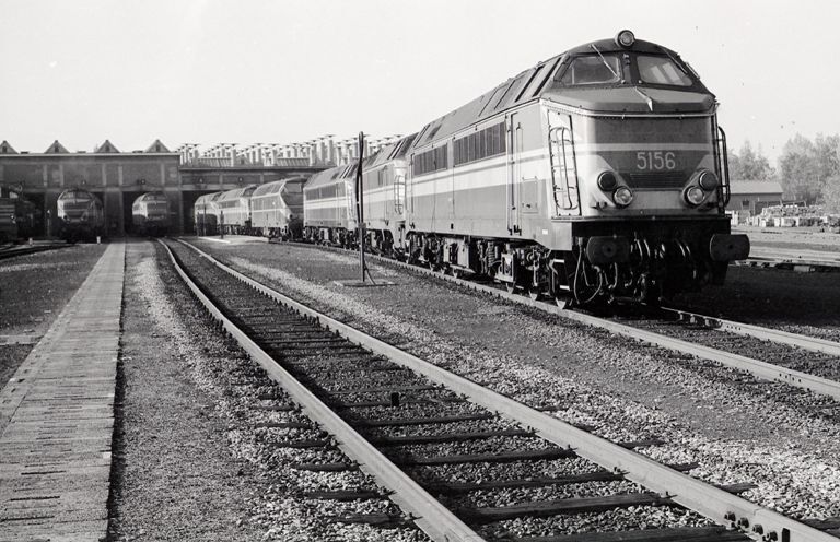 Locomotief 5156 behoort tot de reeks 51. Achter deze locomotief zien we nog enkele diesellocomotieven voor de poorten van de dieseltractiewerkplaats.