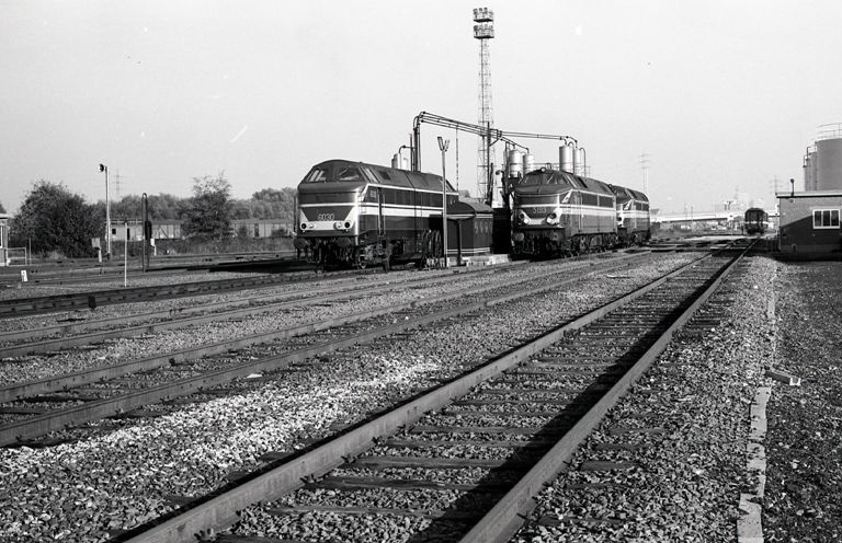Locomotief 6030 behoort tot de reeks 60 en locomotief 5193 tot de reeks 51. Beide locomotieven staan aan de pompinstallatie om gasolie te tanken.