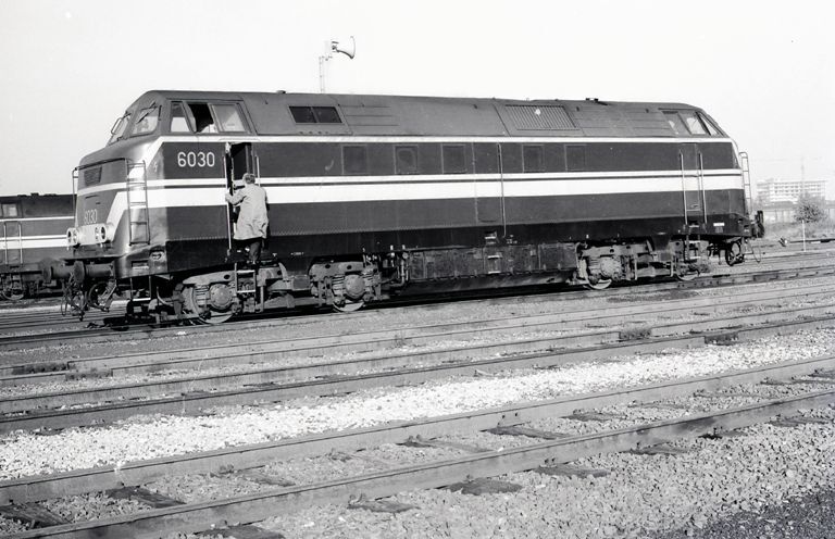 BeschrijvingLocomotief 6030 behoort tot de reeks 60. Een spoorwegbediende klimt in de stuurpost.