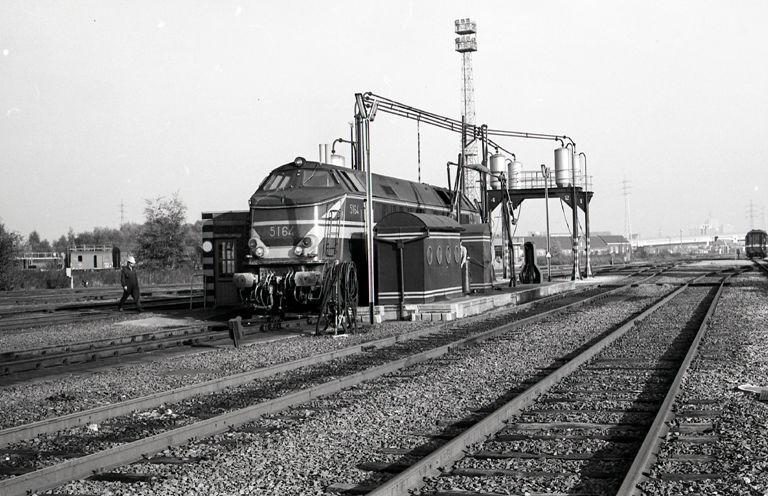 Locomotief 5164 behoort tot de reeks 51. Deze locomotief tankt gasolie vanuit de pompinstallatie (rechts naast de locomotief).