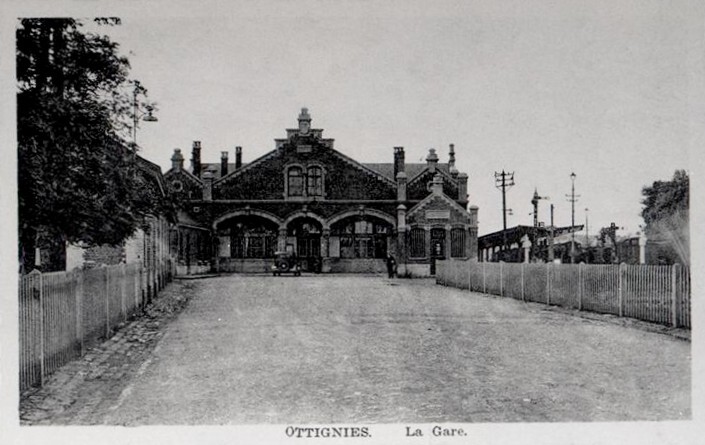 Reproductie van een postkaart met als opschrift 'Ottignies. - La Gare.' Voor de voorgevel van het stationsgebouw staat een auto geparkeerd. Achter de houten afsluiting zien we rechts een telefoon- en telegraafpaal, twee mechanische seinen, twee waterkolommen, een perron met luifel en verlichtingspalen.