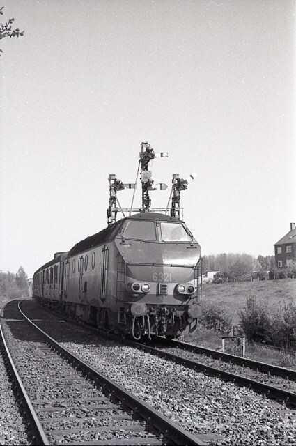Op de foto zien we diesellocomotief 6321 met een reizigerstrein in de buurt van Edingen. De trein bestaat uit een aantal L-rijtuigen. Achter de trein zien we een kandelaarsein.