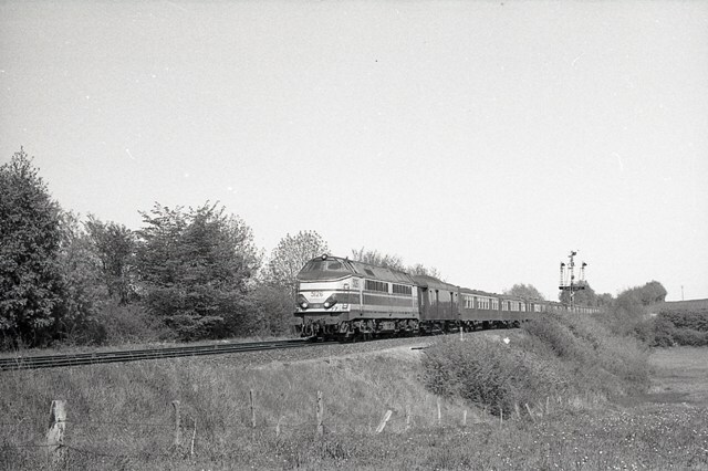Op de foto zien we diesellocomotief 5186 met een reizigerstrein in de buurt van Edingen. De trein bestaat uit enkele M -2 rijtuigen. In de achtergrond zien we een kandelaarsein.