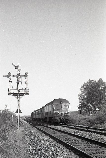 Op de foto zien we diesellocomotief 5927 met een reizigerstrein bestaande uit enkele M 1-rijtuigen. Naast de trein zien we een kandelaarsein met drie masten.