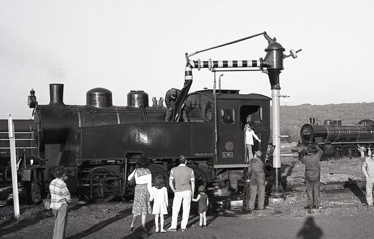 Deze privéstoomlocomotief SA01 neemt deel aan het jaarlijkse stoomfestival van de 'Chemin de fer à vapeur des trois vallées' (CFV3V). We zien hoe de machinist het waterreservoir van de locomotief vult met behulp van een waterkolom. Bezoekers van het festival kijken toe. Schenking van Myriam Hendrickx.