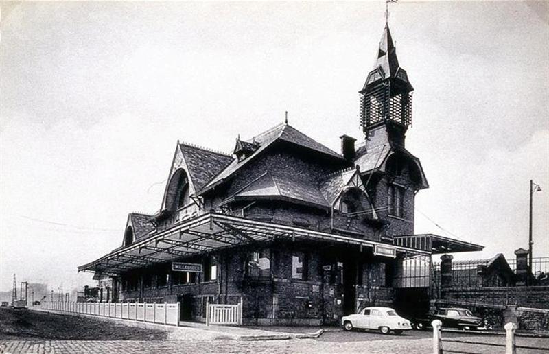 Deze dia is een reproductie van een postkaart zonder opschrift. De postkaart toont de voor- en zijgevel van het stationsgebouw. Het gebouw is uitgerust met een luifel en een toren voor telefoon en telegrafie. Naast het gebouw staan twee auto's geparkeerd. Rechts leidt een helling naar de perrons van de verhoogde spoorlijn 54 Mechelen - Sint-Niklaas. De sporen van lijn 61 Willebroek - Londerzeel - Opwijk - Aalst zijn uitgebroken. Voor het station bakent een betonnen afsluiting het spoorwegdomein af.