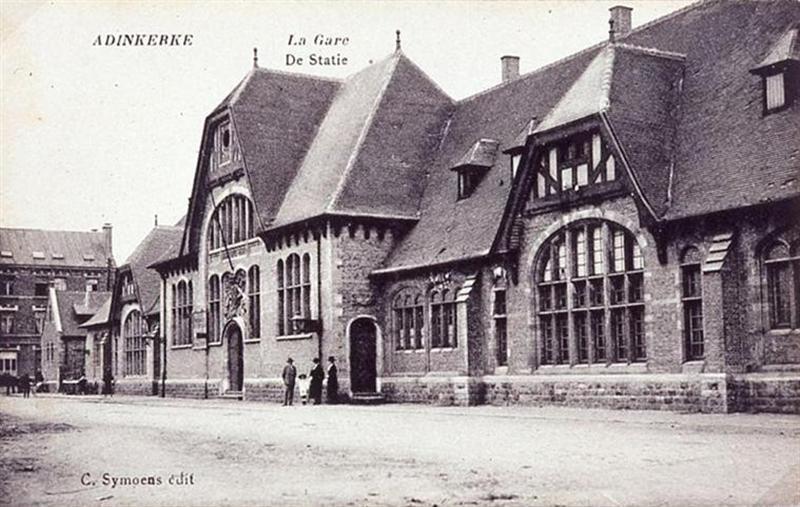 Reproductie van een postkaart met als opschrift 'Adinkerke La gare De Statie' en als uitgever 'C. Symoens édit'. De postkaart toont de voorgevel van het stationsgebouw. Drie volwassenen en een kind kijken in de richting van de fotograaf. Het stationsplein ligt er onverhard bij.