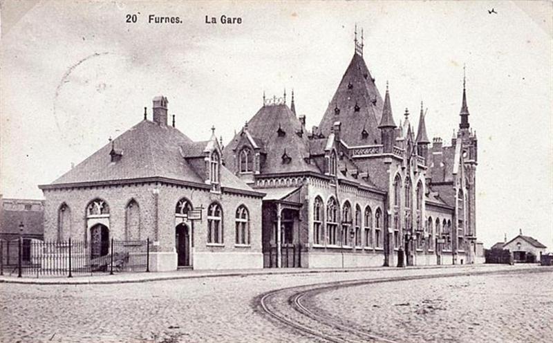 Deze dia is een reproductie van een postkaart met als opschrift '20 Furnes. La Gare'. De postkaart toont de voor- en zijgevel van het stationsgebouw. Tussen het hoofd- en bijgebouw is een deel van de luifel zichtbaar. De uurwerktoren, torentjes en hoge spitsboogvensters geven het station een neogothisch uitzicht. Over het verharde stationsplein lopen rails van de buurtspoorwegen.