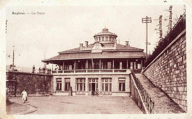 Deze dia is een reproductie van een postkaart met als opschrift 'Angleur. - La Gare'. De postkaart toont de voorgevel van het stationsgebouw, gelegen tussen lijn 43 (Luik - Marloie) en lijn 37 (Luik - Duitse Grens). De luifel biedt de reizigers die van de ene lijn op de andere willen overstappen voldoende beschutting tegen regen en wind. Rechts van het gebouw staan een elektriciteitsmast en twee mechanische seinen.