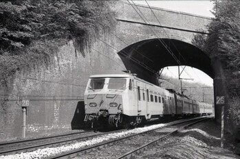 BeschrijvingMotorstel 840 behoort tot reeks 08, schijf 1977. Het stel rijdt onder een brug door. Links en rechts van de sporen zien we kilometerpalen '26'.