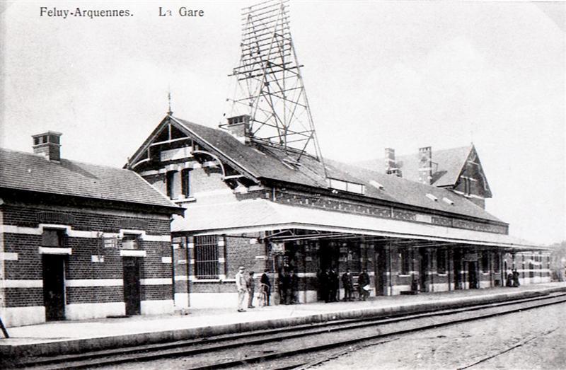 Reproductie van een postkaart met als opschrift 'Feluy-Arquennes. La Gare'. Aan de achterzijde van het stationsgebouw wachten onder de luifel reizigers en spoorwegpersoneel op de komst van de trein. Op het dak staat een telefoon- en telegraafmast. Links van het station bevinden zich de toiletten. De dwarsliggers zijn met ballast bedekt. Feluy-Arquennes ligt op de lijn 141 Manage – Baulers – Ottignies.