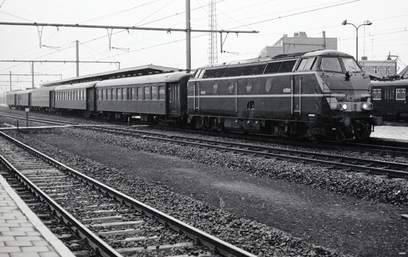 Deze locomotief behoort tot de reeks 62. Zij heeft een trein bestaande uit K 2- en K 3-rijtuigen aan de haak. De locomotief is uitgerust met een derde koplamp. In de achtergrond zien we de luifels van de perrons en een elektrisch motorstel reeks 00 met klassieke spoorafnemer op een ander spoor. Schenking van Myriam Hendrickx.