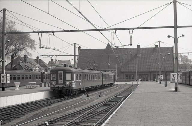 Motorstel 179 hoort tot de reeks 00 schijf 1962. Het staat aan het perron voor het kopstation Knokke. Op de perrons zien we reclamepanelen, lantaarnpalen, banken en lege bloempotten. Knokke is het eindpunt van spoorlijn 51B (Brugge) - Y Dudzele - Knokke. Schenking van Myriam Hendrickx.