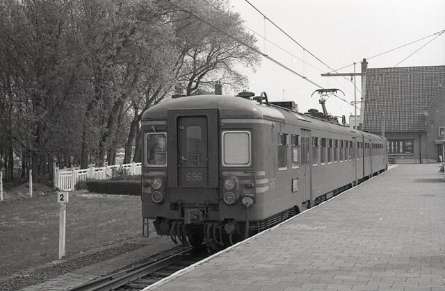 Motorstel 696 hoort tot de reeks 06 schijf 1973. Het staat aan het perron van station Knokke. Knokke is het eindpunt van spoorlijn 51B (Brugge) - Y Dudzele - Knokke. Links zien we een kilometerpaal '2' langs het spoor. Rechts zien we nog een deel van het stationsgebouw. Schenking van Myriam Hendrickx.