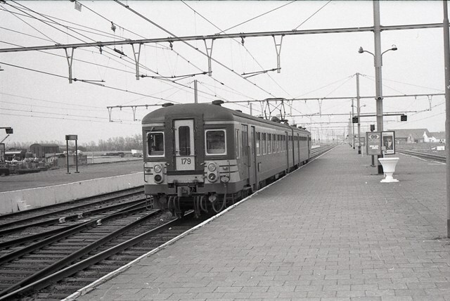 Motorstel 179 hoort tot de reeks 00 schijf 1962. Het staat aan het perron van het station Knokke. Op de perrons zien we reclamepanelen, lantaarnpalen, bloempotten en een stationsnaambord. Knokke is het eindpunt van spoorlijn 51B (Brugge) - Y Dudzele - Knokke. Schenking van Myriam Hendrickx.