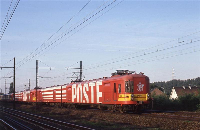 Deze fotogroep bevat twee dia's. We zien postmotorstellen 968 en 966 ter hoogte van Eppegem. Deze waren uitzonderlijk gekoppeld aan de elektrische stellen 671, 733 en 632 ter gelegenheid van het jaarlijkse wandel- en fietsevenement 'De Gordel'. De poststellen werden speciaal voor dit evenement gebruikt voor het transport van de fietsen van de deelnemers. Schenking van Myriam Hendrickx.