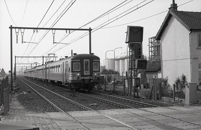 Een reizigerstrein komt aan in station Zandvoorde. De trein bestaat uit drie tweeledige motorstellen met de nummers 173, 728 en 151. Motorstellen 151 en 173 behoren tot reeks 00, schijf 1962. Het nummer 728 behoort tot reeks 06, schijf 1974. Zandvoorde ligt langs de lijn 50A Brussel-Zuid - Gent-Sint-Pieters - Brugge - Oostende. Aan de overweg zien we een lichtsein. Schenking van Myriam Hendrickx.